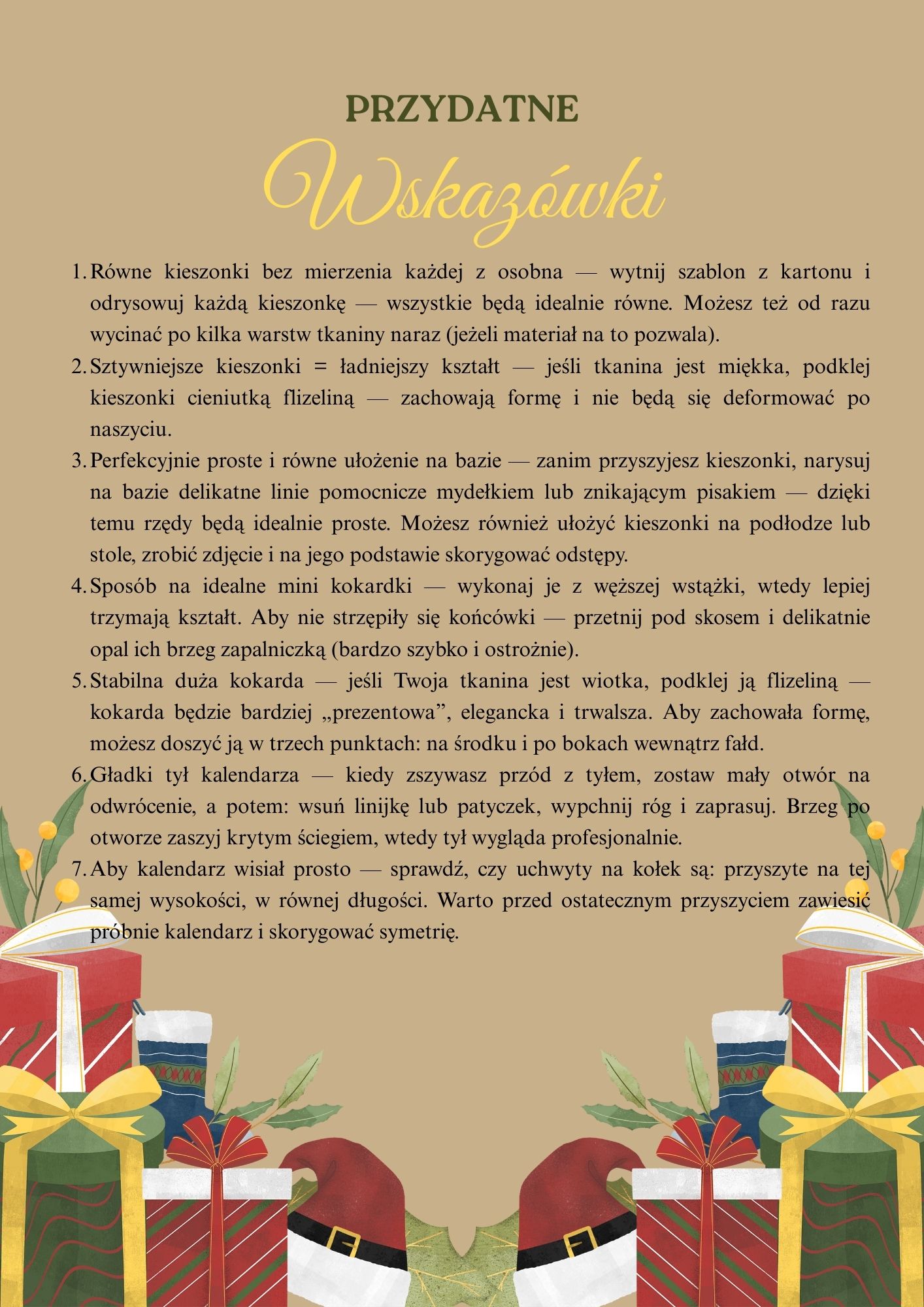 Ten projekt to radość grudnia w czystej formie. Kalendarz adwentowy uszyty tak, by przypominał duże pudełko prezentowe, ozdobione kokardą. Składa się z kieszonek w kształcie małych prezentów — po jednej na każdy dzień grudnia. W każdej możesz ukryć słodkość, karteczkę, drobny upominek lub zadanie. To projekt, który nie tylko zdobi wnętrze, ale też buduje codzienny, ciepły rytuał oczekiwania na święta.