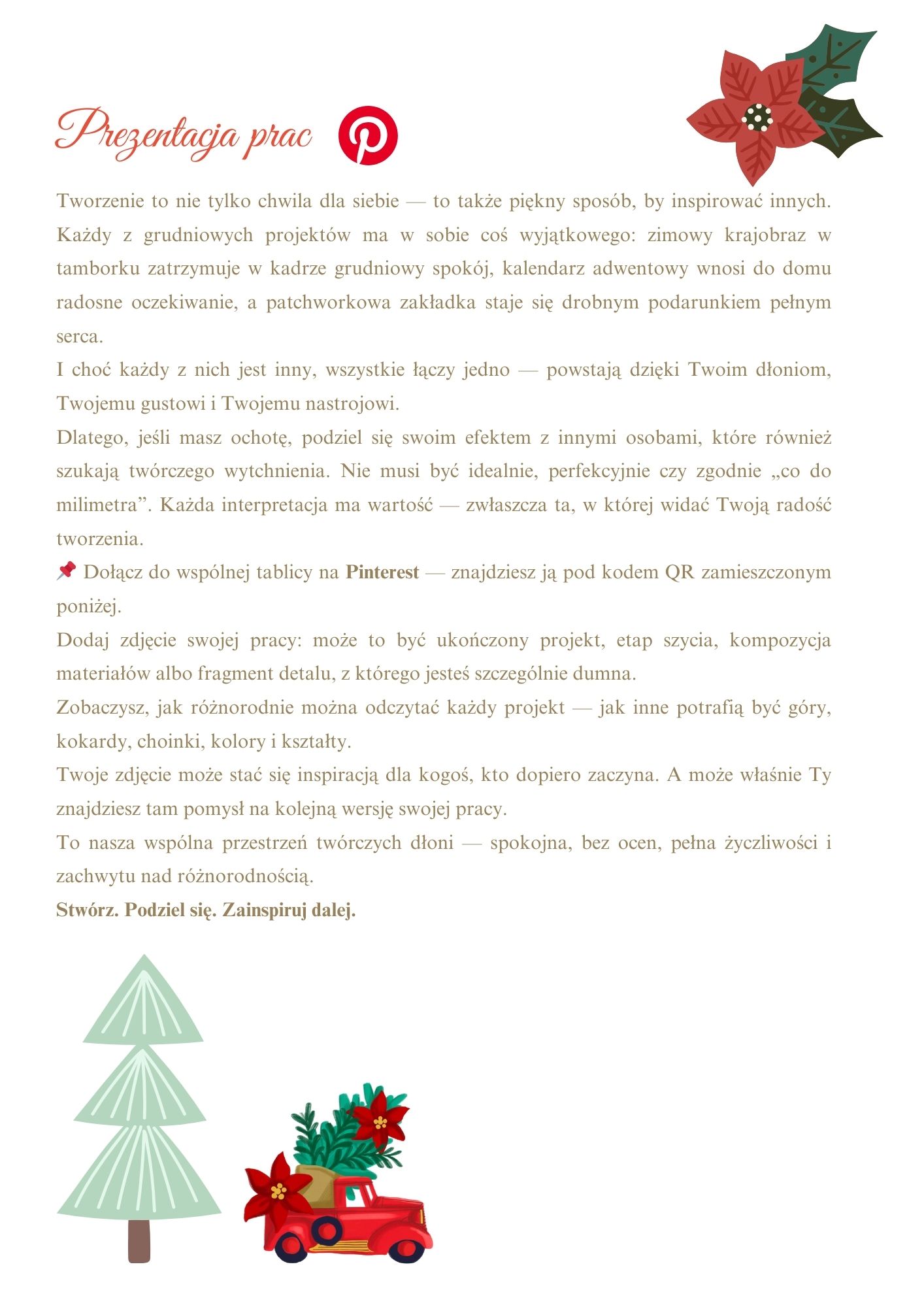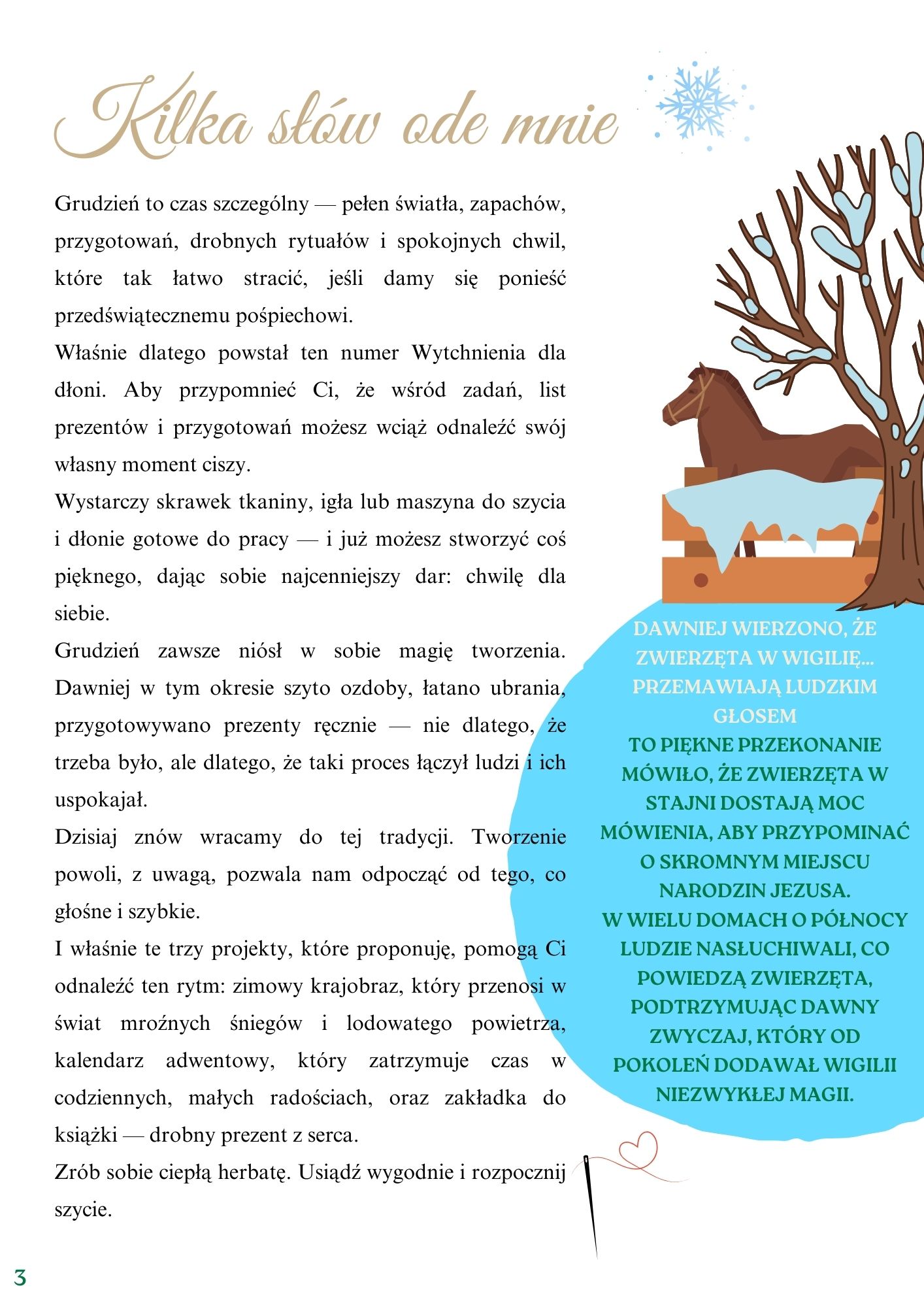 Grudniowy numer Wytchnienia dla dłoni to zaproszenie do zwolnienia tempa i odnalezienia spokoju w twórczym działaniu. W czasie, gdy wokół nas narasta pośpiech, obowiązki i lista „do zrobienia”, szycie może stać się cichą przystanią — momentem tylko dla Ciebie, Twoich dłoni i myśli, które wreszcie mogą zwolnić.